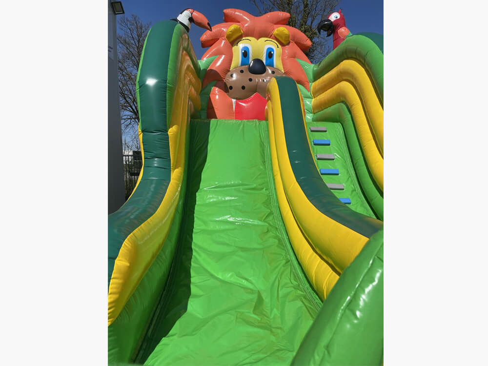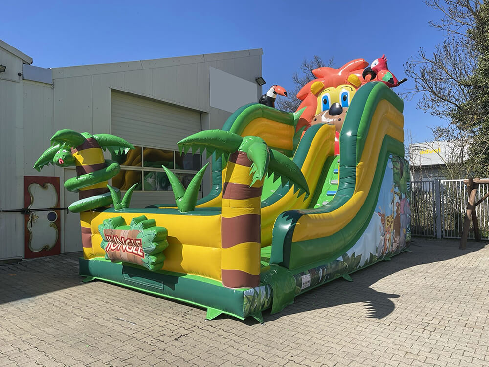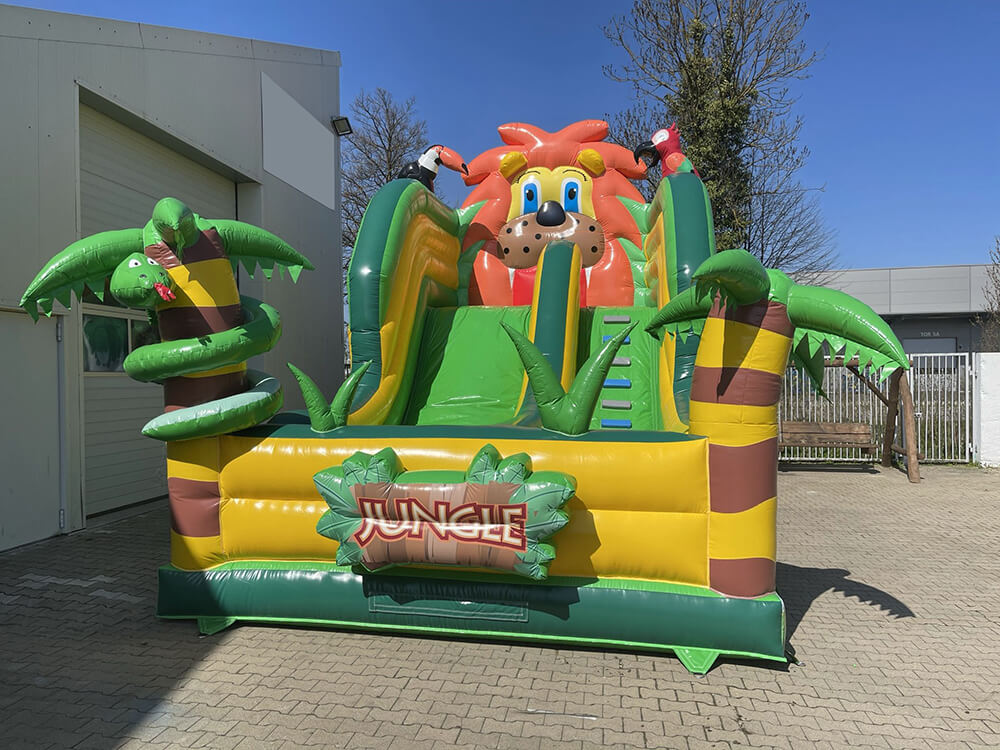 Beleef een avontuur met onze spectaculaire Mega Jungle Glijbaan! Op elk feest of evenement een echte blikvanger. Met zijn 6 meter hoogte torent deze kleurrijke jungle-attractie boven alles uit en trekt hij direct de aandacht van jong en oud. Klim naar boven langs de palmbomen en roetsj vervolgens lekker naar beneden voor een onvergetelijke adrenalinekick!
